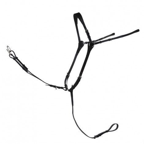Collier de chasse trois points se fixant sur les sanglons et évitant les pressions au niveau du garrot. Pont large et anatomique pour libérer le garrot. La martingale est réglable et amovible.