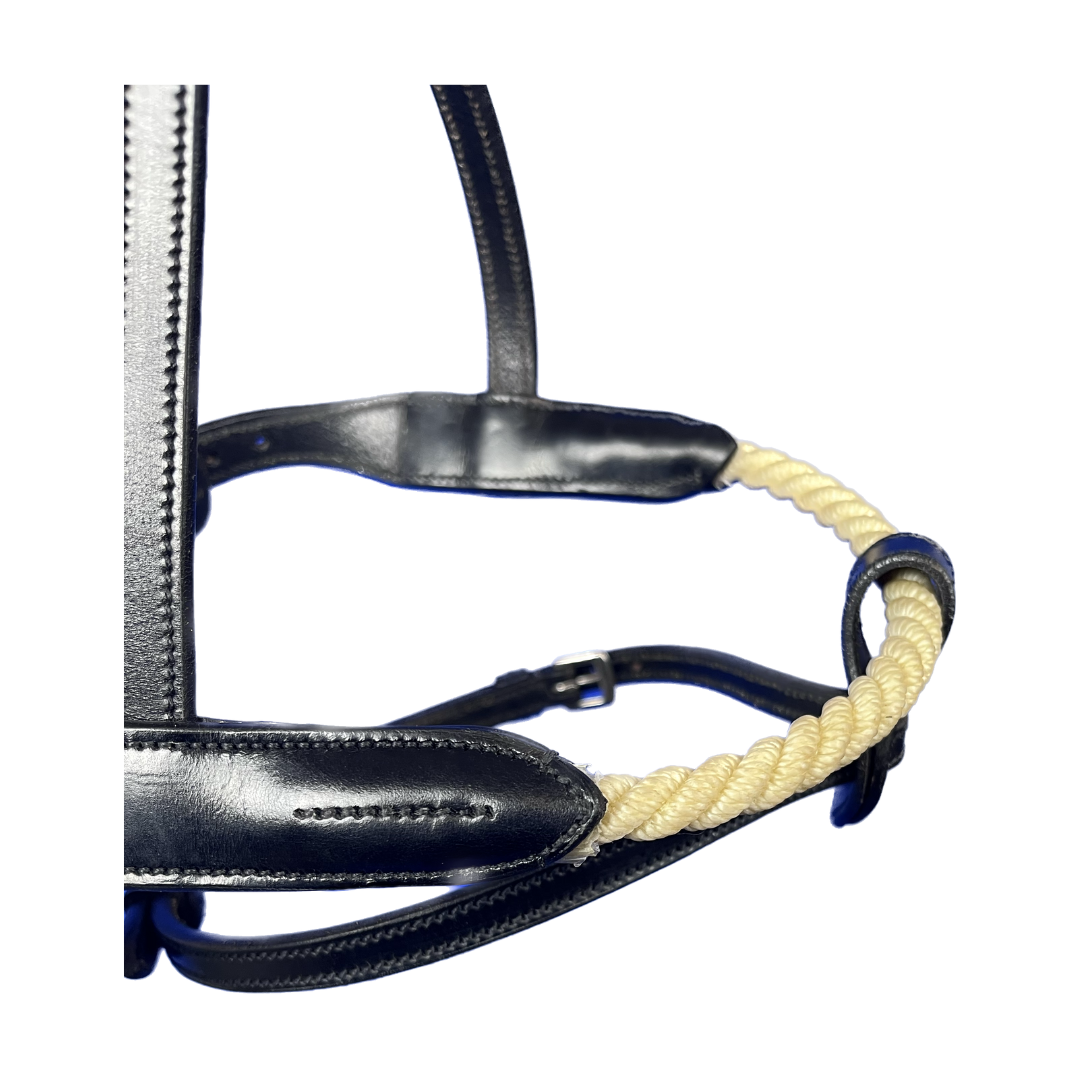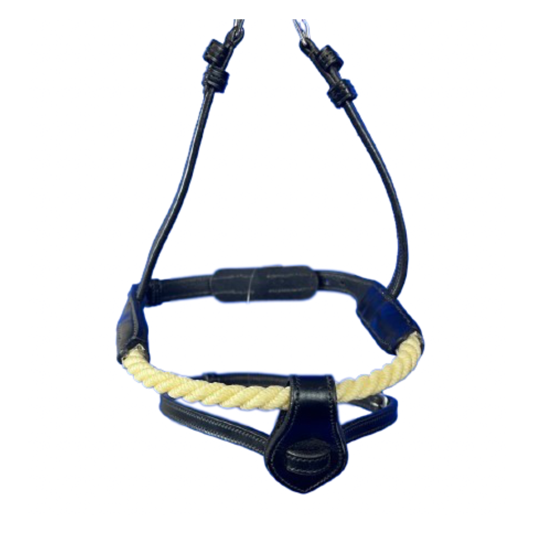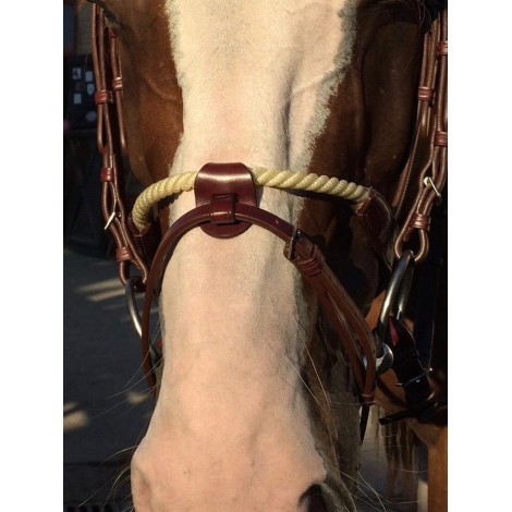 Ce modèle combine l’effet d’une muserolle française avec positionnement de la partie supérieure sous l’arrête zygomatique, avec l’action de la corde sur le chanfrein qui permet un meilleur contrôle. Le noseband amovible en cuir fournit avec la muserolle permet de rajouter un effet de fermeture sur la bouche du cheval. Cette muserolle aura donc une action beaucoup plus forte qu’une muserolle combinée en cuir.