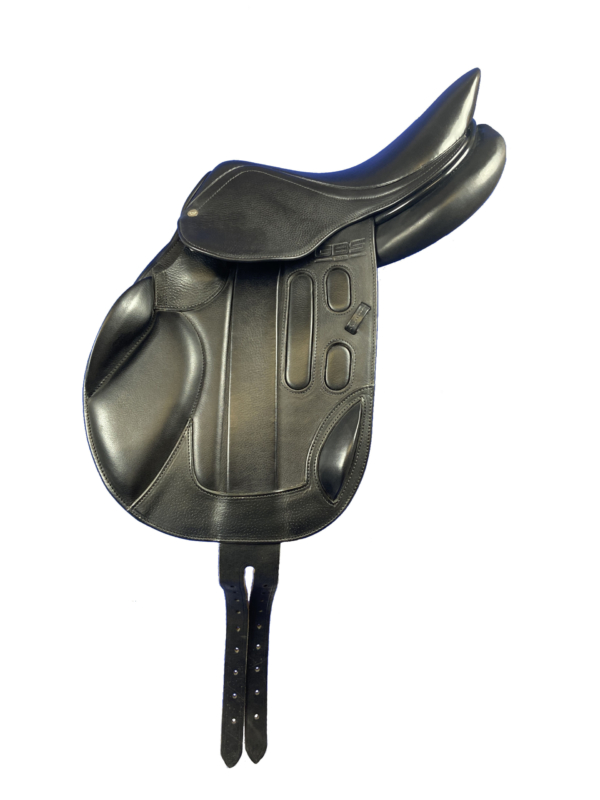 La présence d’une sangle ainsi que son dessin particulier permettent de conserver les quartiers au contact du cheval offrant ainsi fixité et précision des aides.