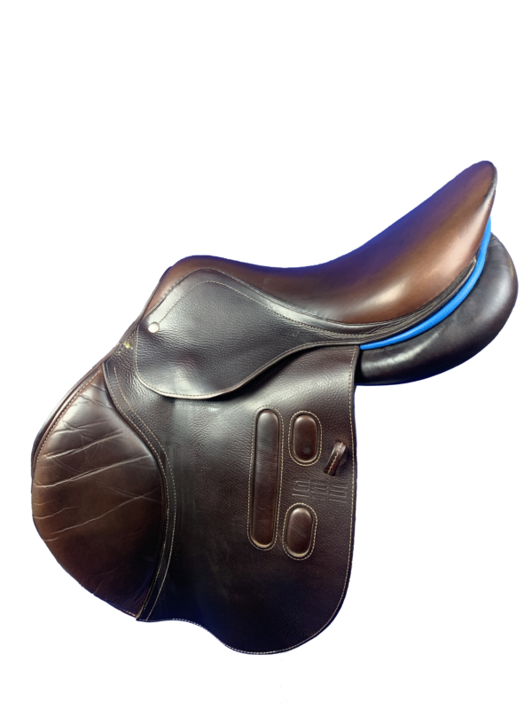 Cette selle possède un siège en 17,5′ et de grands quartiers. Elle conviendra à un cavalier ayant un long fémur.
